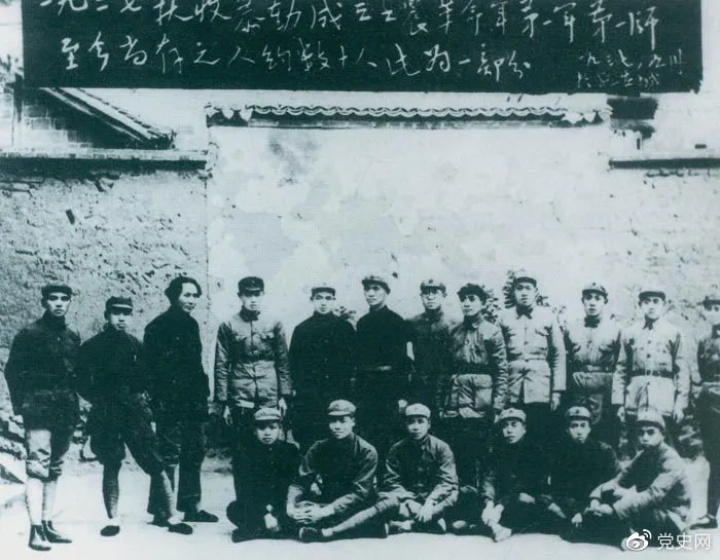 1927年9月9日,以毛澤東為書記的中共湖南省委前敵委員會(huì),領(lǐng)導(dǎo)工農(nóng)革命軍第一師發(fā)動(dòng)湘贛邊界秋收起義。圖為毛澤東在延安和當(dāng)年參加秋收起義的部分同志合影。